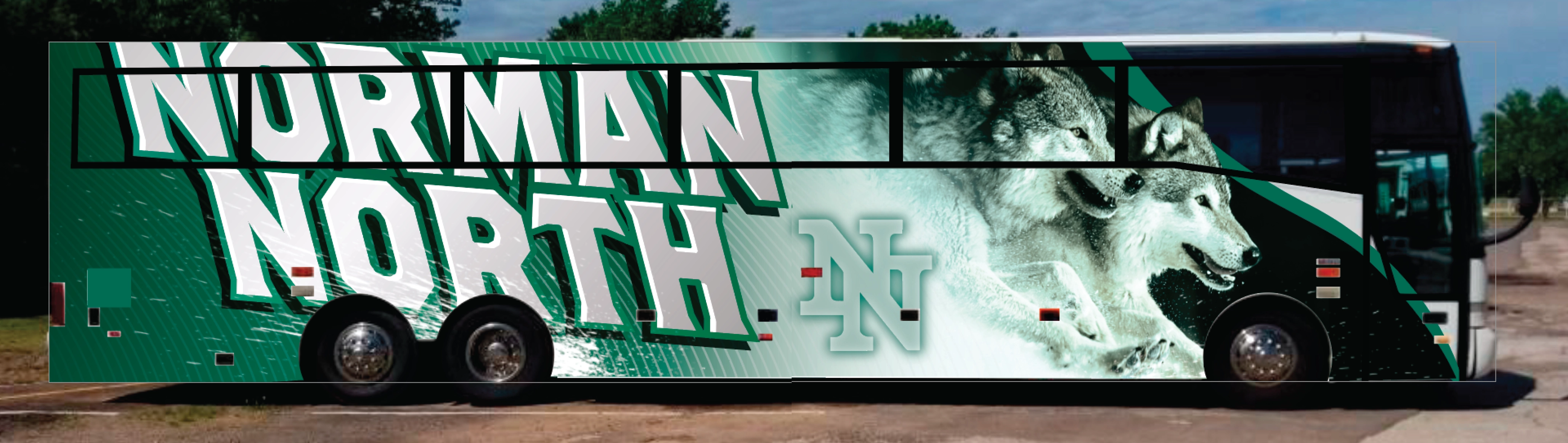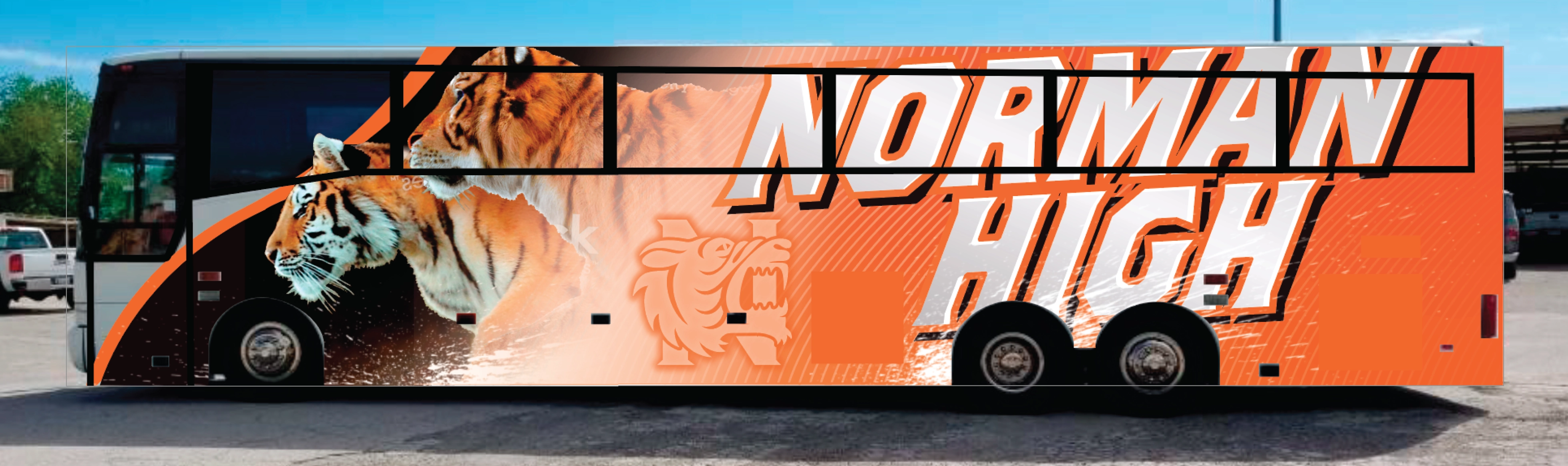 Norman, OK has two main high schools, and the school district needed an activity bus that shows pride for each school. I designed a full vehicle wrap for this shared activity bus that unifies two high school identities, wolves on one side, tigers on the other, while precisely navigating obstructions across the massive surface to ensure every graphic element lands exactly right.